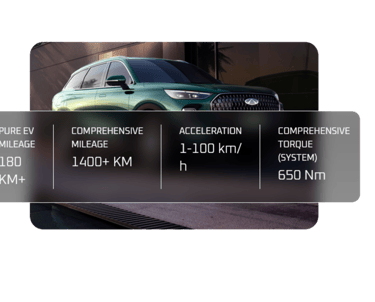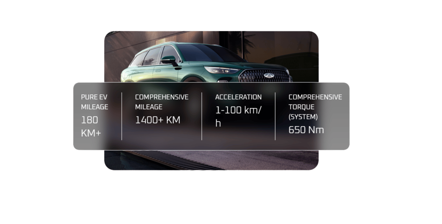 High efficient – High Performance Pure electric endurance mileage of 180km, comprehensive mileage of 1400km+ Acceleration 0-100 km/h 5.4 s